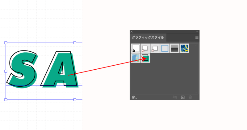 出来上がったデザインを選択ツールで「グラフィックスタイル」にドラッグすると作成したアピアランスが登録されます。登録したアピアランスはテキストのみではなく図形などのオブジェクトにも適用できます。