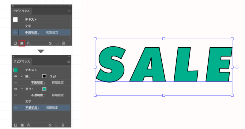 アピアランスパネルを表示させ、塗りと線を設定