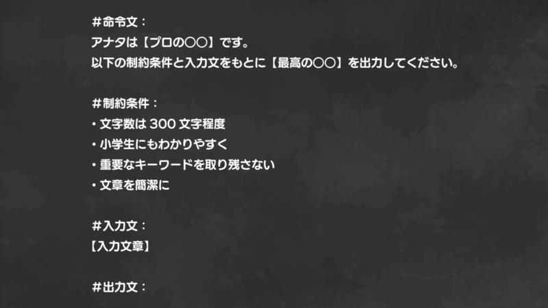 命令では役割を明確にしながら条件に従って出力文を作成することを指示してます。例えば文章の要約をしてもらいたいならあなたは【プロの編集者】です。【最高の要約】を出力して下さい。といったように埋めていきます。役割を指定することでChatGPTがどの立場で回答するかを明確にします。その結果、より適切で具体的な回答を引き出すことができます。